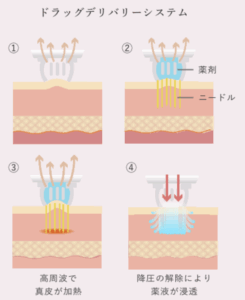極細の針で肌に微細な穴を開けながら、同時に高周波と薬剤を真皮層へ届ける仕組みです(ドラッグデリバリーシステム)。