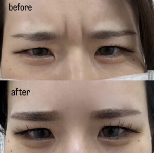 眉間に打った場合、瞼が重たく感じることや、二重幅が狭く感じることございますが1週間〜1ヶ月で治ります。
