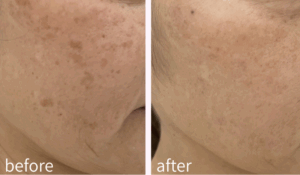 こちらの40代女性の患者様は、気になるシミに対してピコスポット治療を行いました。Before & Afterの写真をご覧いただくと、濃いシミが大幅に改善され、お肌全体が明るく均一なトーンになっています。