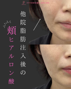 脂肪が約半分のみ定着し、「もう少し整えたい」とのご希望で、当院にて頬ヒアルロン酸を行いました。