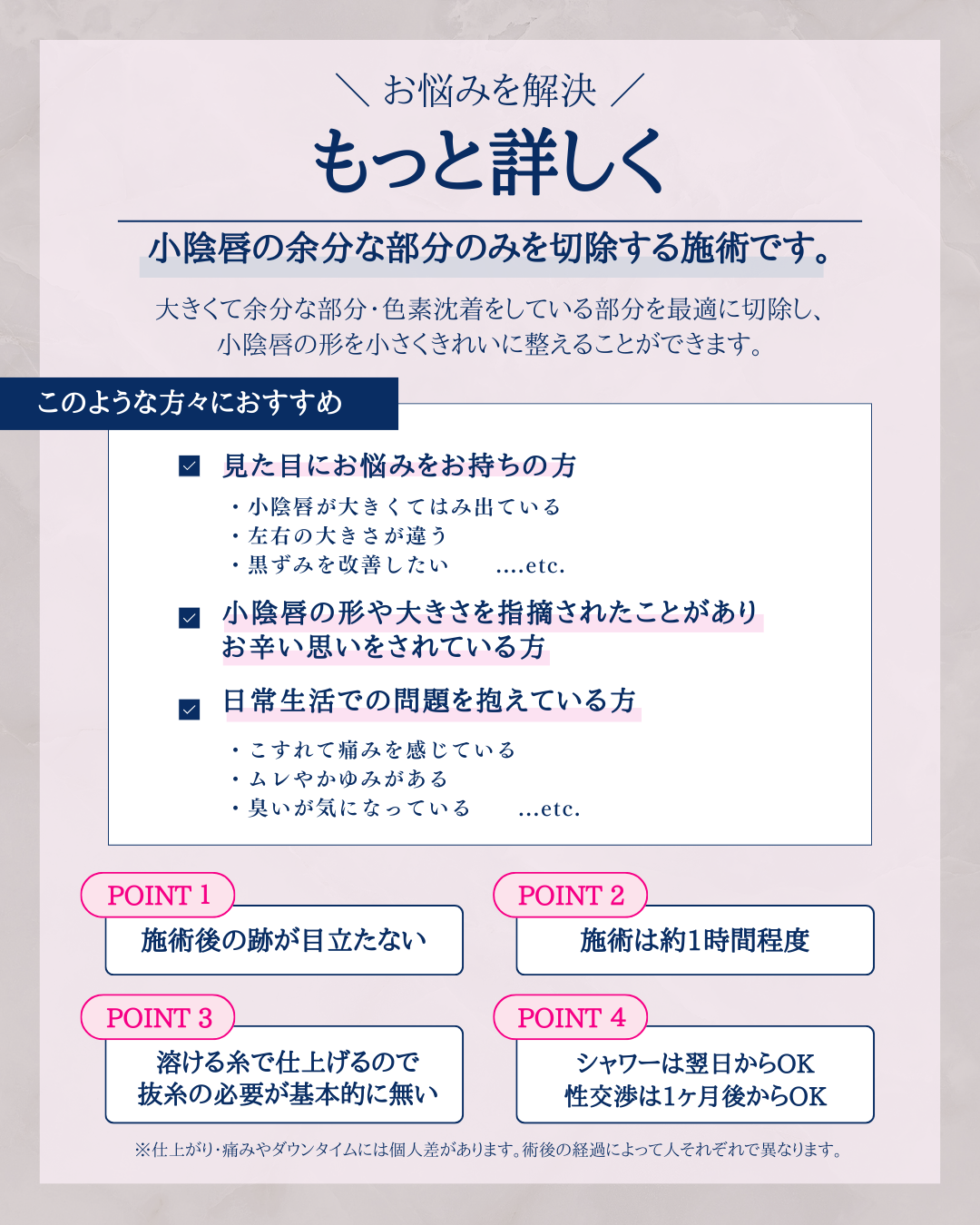 ・本施術は、大きくなって余分な部分・色素沈着している部分を最適に切除し、小陰唇の形を小さく整える施術です。