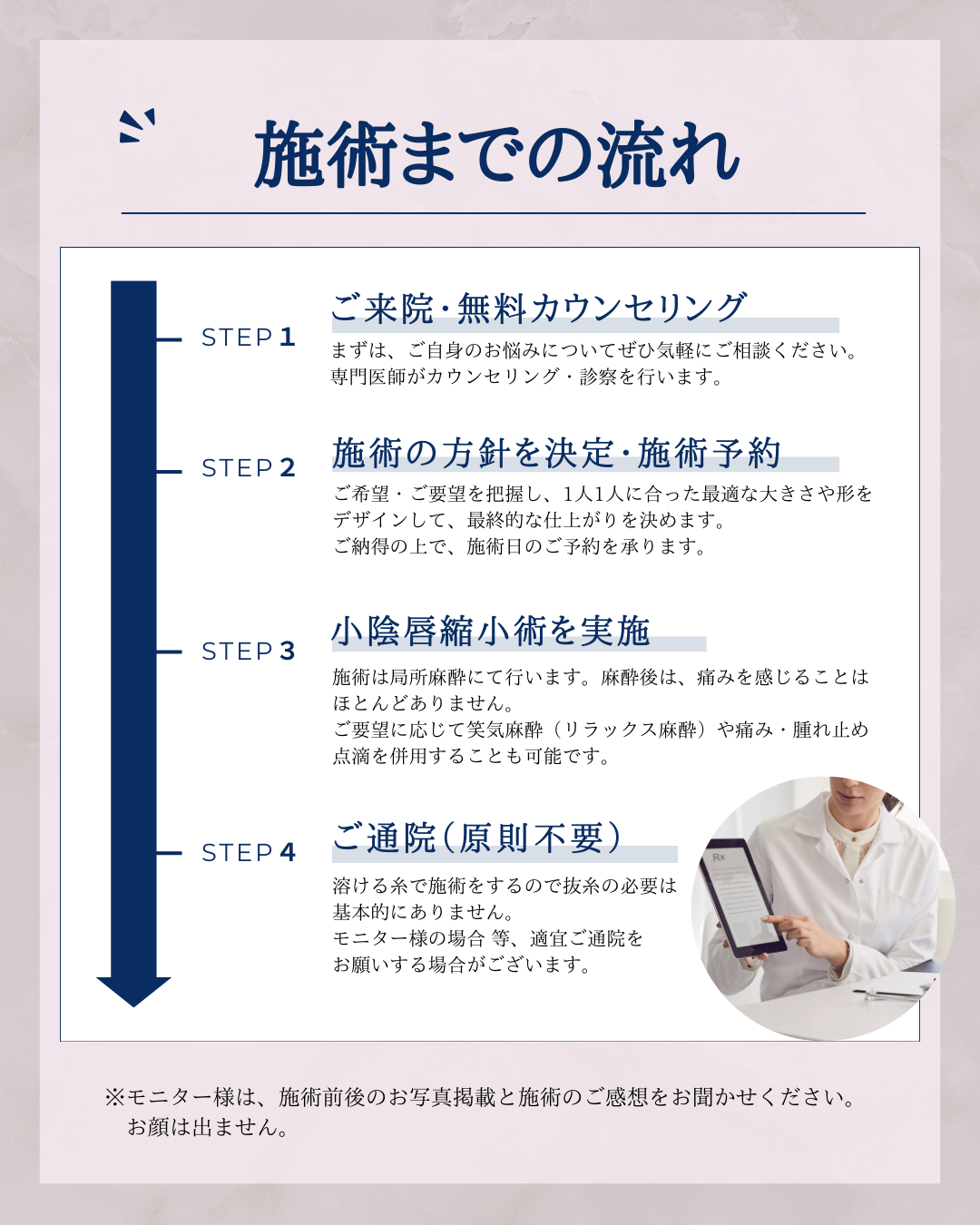 ※モニター様は、施術前後のお写真掲載と施術のご感想をお聞かせください。