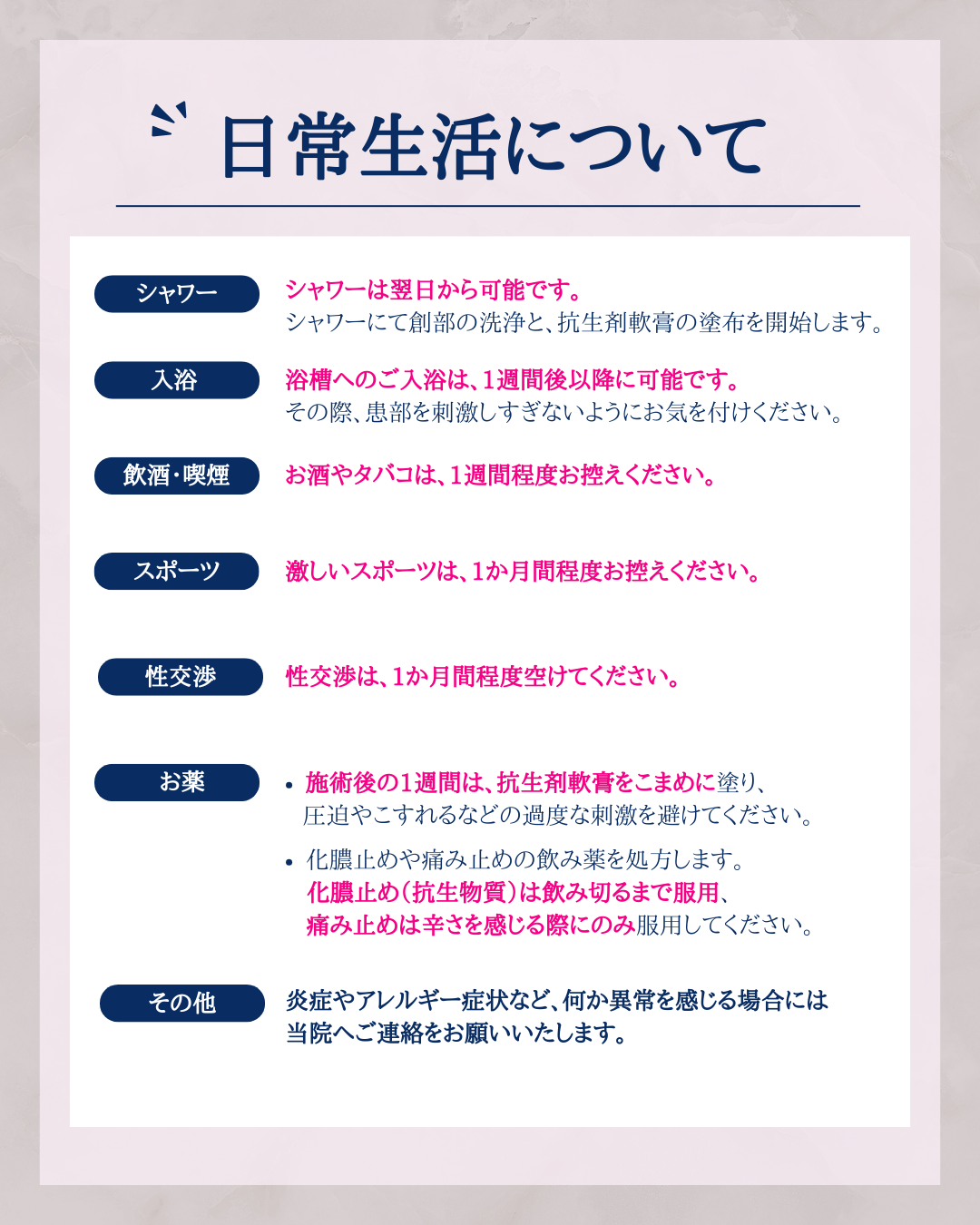 ・激しいスポーツや性交渉は1か月間お控えください。