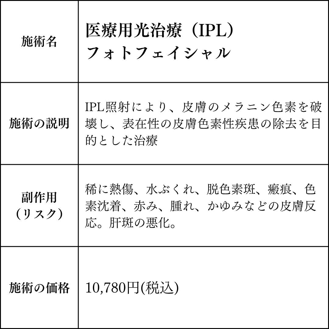 シミが一時的に濃くなる、膨隆、表皮剥離、水疱形成、色素沈着や色素脱失、肝斑の悪化、潜在性肝斑の惹起、瘢痕が生じることがあります。