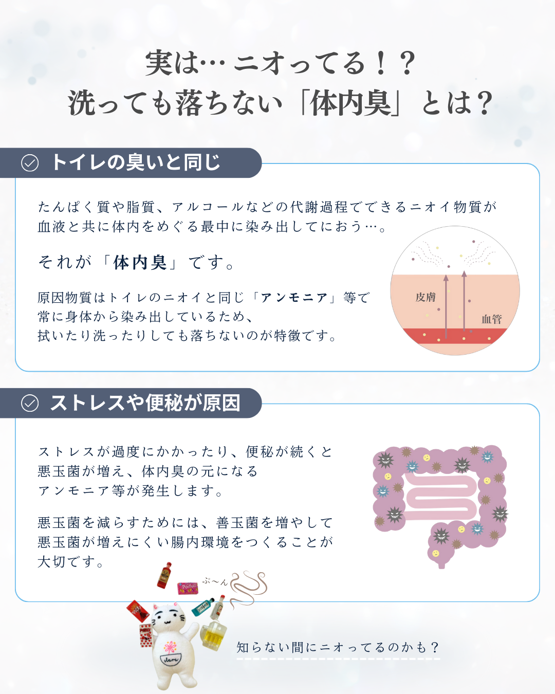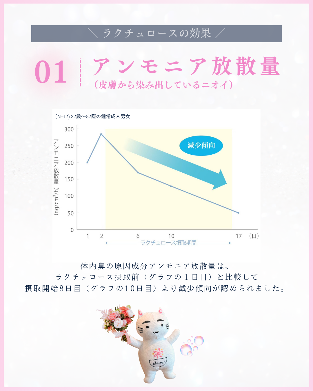・有効成分センスピュール®は、①米胚芽②大豆発酵抽出物③ユッカ抽出物④キラヤ抽出物を配合しております。①・②は腸内フローラ改善、③・④は消臭効果が特に強いと考えられる成分です。