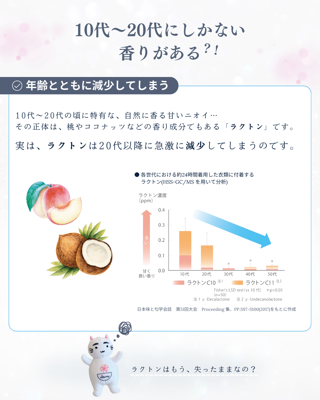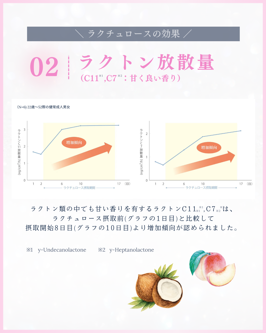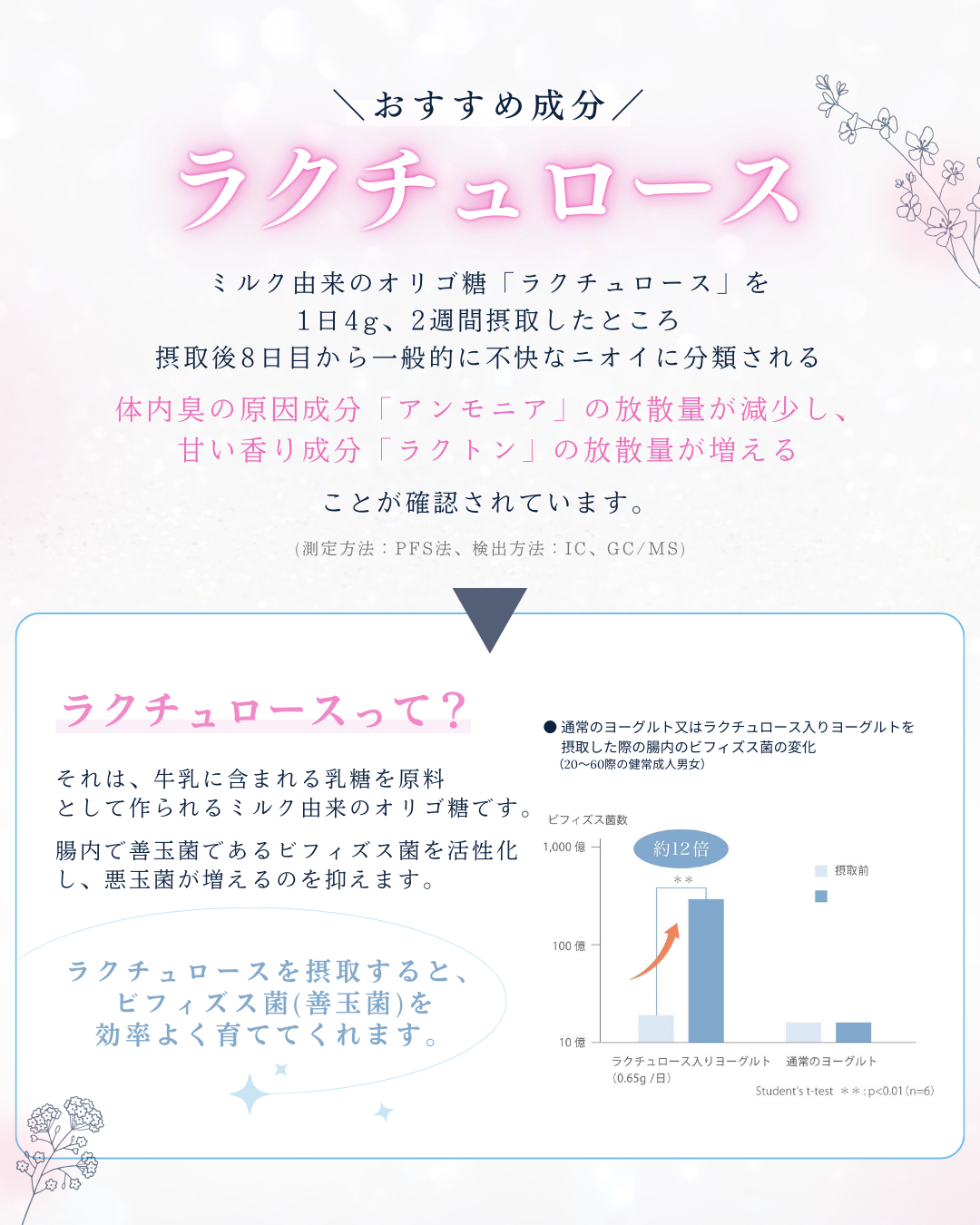 A.ヒトとして生まれた瞬間から、ラクチュロースは必要不可欠なものであると言えます。自然の植物・穀物成分から抽出したセンスピュール®と二人三脚で、本来あるべき内面から湧き出る良い匂いを築き上げてくれます。