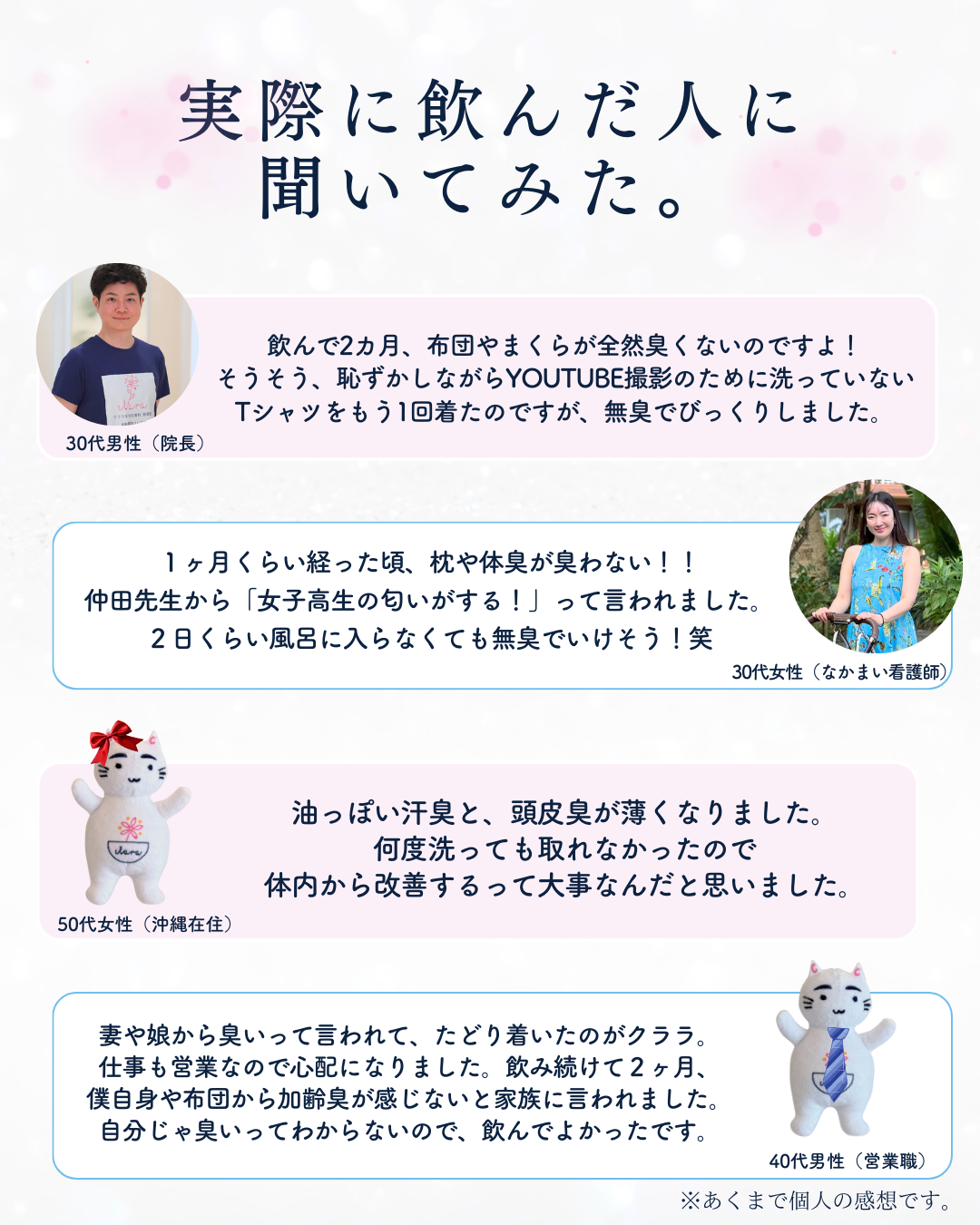 A.「ご実感を大切に、美容貯金としてお好きに飲まれてください。」