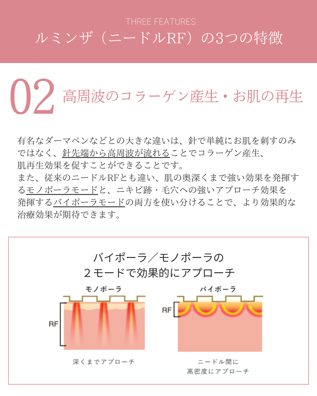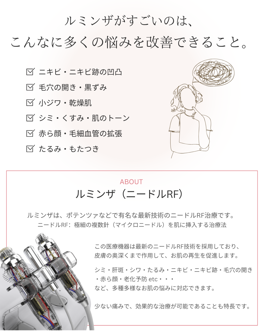 ルミンザは、髪の毛のように極細の針(多数)と、高周波のエネルギーを利用する施術です。