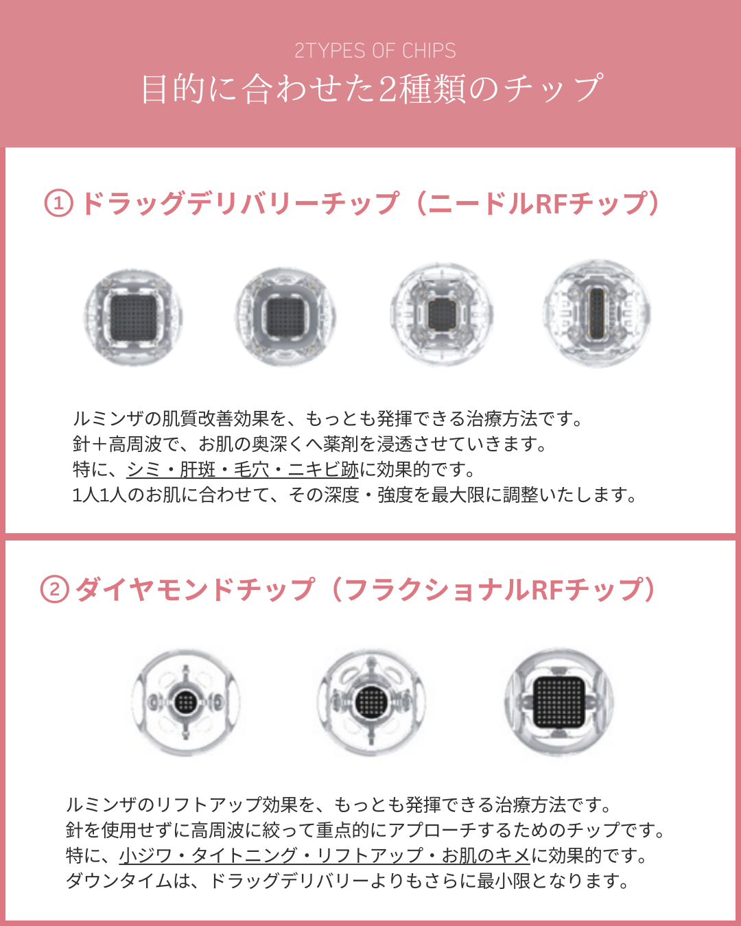 ダイヤモンドチップ(リフトアップ特化モード)では、高周波のシャワーをお肌に浴びせます。医療ハイフが超音波で、ダイヤモンドチップは高周波ですが、強力な熱エネルギーがお肌のリフトアップ(+タイトニング)効果をもたらす意味では共通しております。ライバルの医療ハイフと、まさにリフトアップ戦国時代と言えるでしょう。ハイフとルミンザ、どちらが良いのかは、お肌の表面の状態・厚み・もたつきの程度によって絶妙に1人1人異なるので、ぜひ担当医師にご相談ください。また、こちらは針を用いない治療なので、ドラッグデリバリーよりもダウンタイムがさらに少ないことが特徴です。