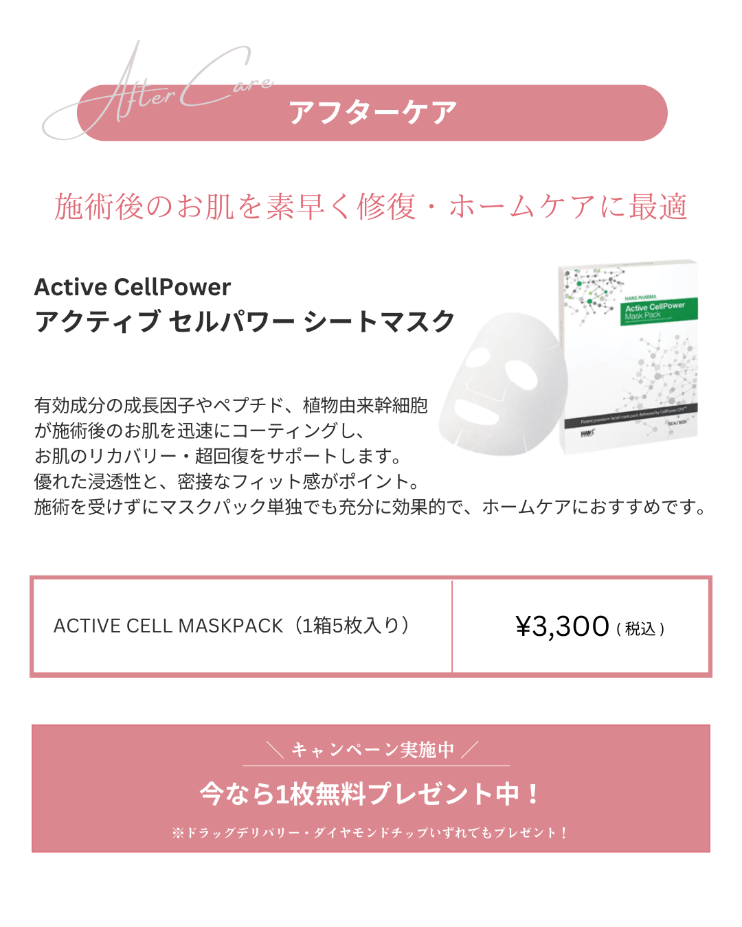 A.ドラッグデリバリーについては、他のダーマペンなどの針治療と比べても、思ったよりダウンタイムは少ないです。針を使用していても、高周波には止血作用があるためです。施術後のデリケートなお肌をコーティングする、専用のマスクパックも現在1枚無料プレゼント中です。