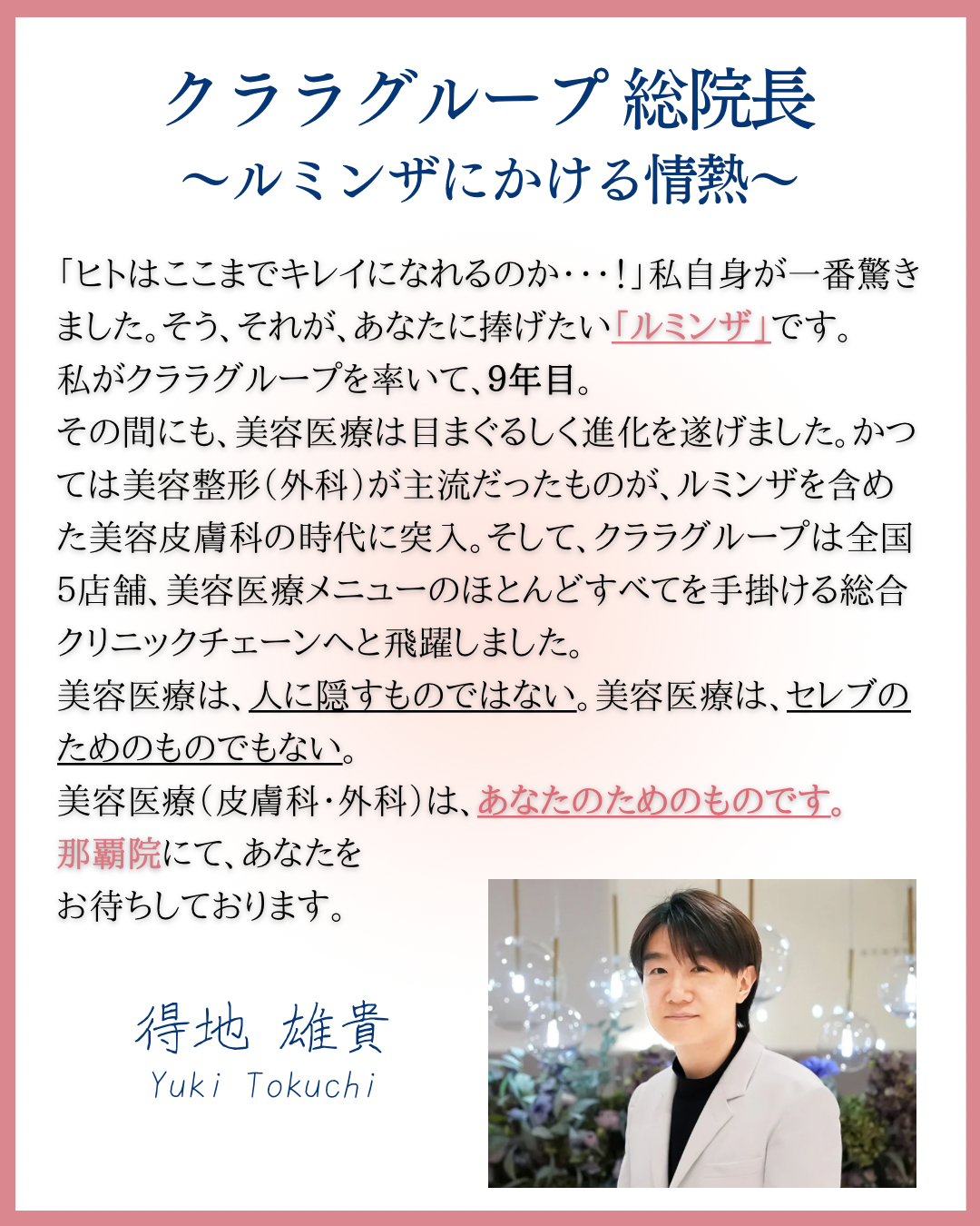 私、仲田が一番大切にしていることは、【あなた自身が自分のお肌をを理解できること】を応援することです。2万人以上の方々がクララ那覇院へご来院され、沖縄の方のたくさんのお悩みに寄り添ってまいりました。ぜひ、担当医師へご自身の悩みを遠慮なくお伝えされてください。その上で、ルミンザが最適なのか、他の治療の方が良さそうなのか、はたまた日頃のスキンケアにも原因があるのか、ぜひ一緒に答えを探していきたいと思います。