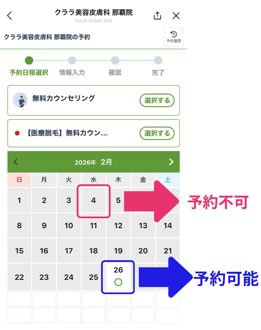A. 下記の予約表をご覧ください、〇印が付いている日が予約可能日となります。