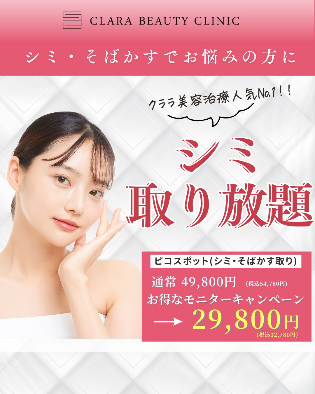 - A . シミの種類や濃さ、大きさによって効果の実感には個人差があります。クララビューティクリニックでは、シミの種類を正確に診断し、ピコレーザー(ピコスポット、ピコトーニング)など最適な治療法をご提案します。ピコスポットの場合、濃いシミであれば1〜2回の治療で効果を実感いただけることも多いですが、薄いシミや広範囲のくすみ改善には、複数回のピコトーニングをおすすめしております。 ▶︎ シミ・くすみ治療の全メニューはこちら ▶︎その他のメンズ美容医療についてはこちら