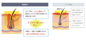 医療脱毛と美容脱毛(エステ脱毛)を比較すると、使用する脱毛機器や照射の出力、施術者が異なるのが特徴です。医療脱毛は高出力レーザーを使うため、毛根ごとしっかり破壊でき、永久脱毛に近い効果が期待できます。