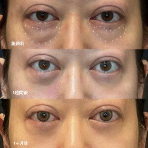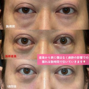 こちらのお客様は直後、麻酔による腫れや膨らみがありますが、数時間で引いていきます。クマの影はすでに改善しているのが分かります。表側に傷は付けていないので比較的直後から綺麗な目元です👨⚕️✨