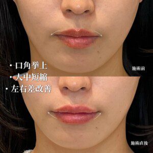 ヒアルロン酸 唇のヒアルロン酸 【ヒアルロン酸】 【施術名】 唇のヒアルロン酸 【施術の説明】 唇にヒアルロン酸を注入し、左右差改善、口角挙上、人中短縮 【施術の副作用(リスク)】 腫れ、内出血 【施術の価格】 円(税込) ※ 他の症例写真を見る