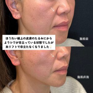 小顔・たるみ 糸リフト 【小顔リフトアップ】 【施術名】 糸リフト 【施術の説明】 糸リフトで気になるほうれい線を引き上げ小顔へ 【施術の副作用(リスク)】 腫れ、ひきつれ 【施術の価格】 円(税込) ※ 他の症例写真を見る